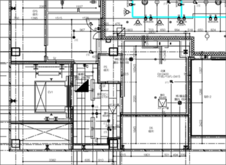 施工図の天井伏図に設備施工図の情報を入れた図面です。その部屋を実際に使用するにあたり、照度が確保できているか、スプリンクラーや煙感装置などの位置が適正かを確認する図面です。